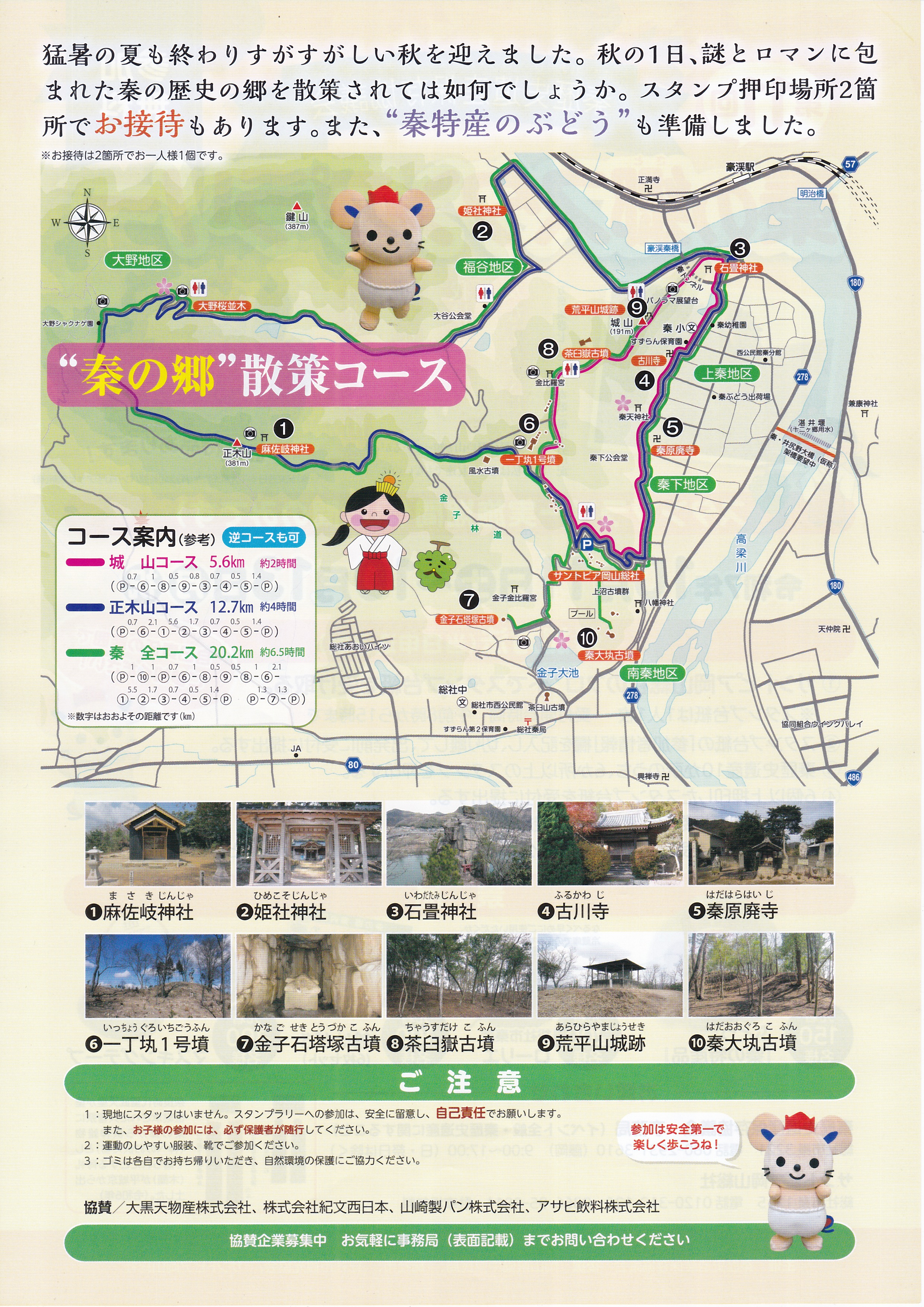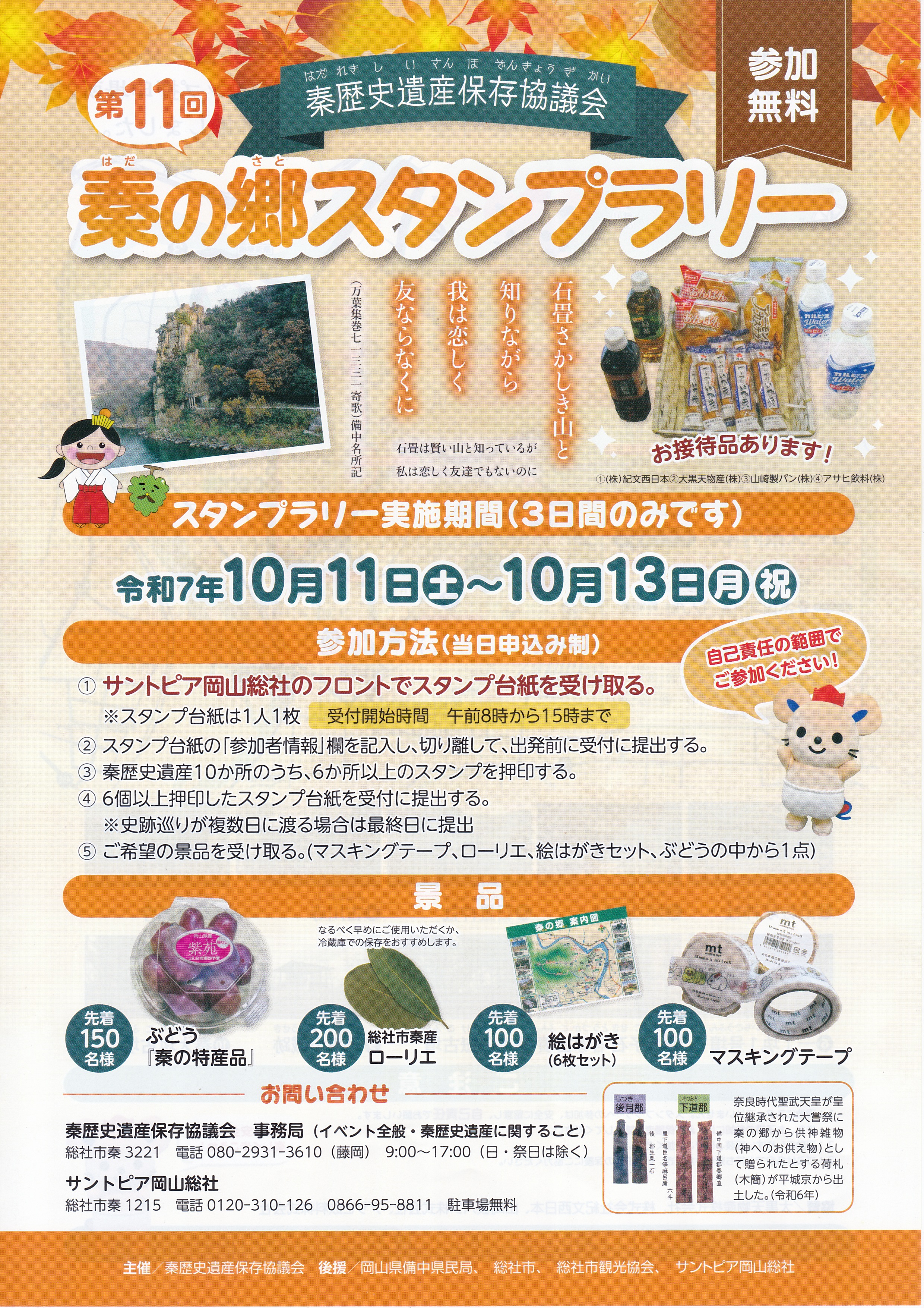 スタンプ6個以上押印された方には秦の特産品のブドウ、絵はがき、ローリ エ、マスキングテープの中から1個差し上げます。いずれも数に限りがあり、 なくなり次第終了とさせて頂きます。